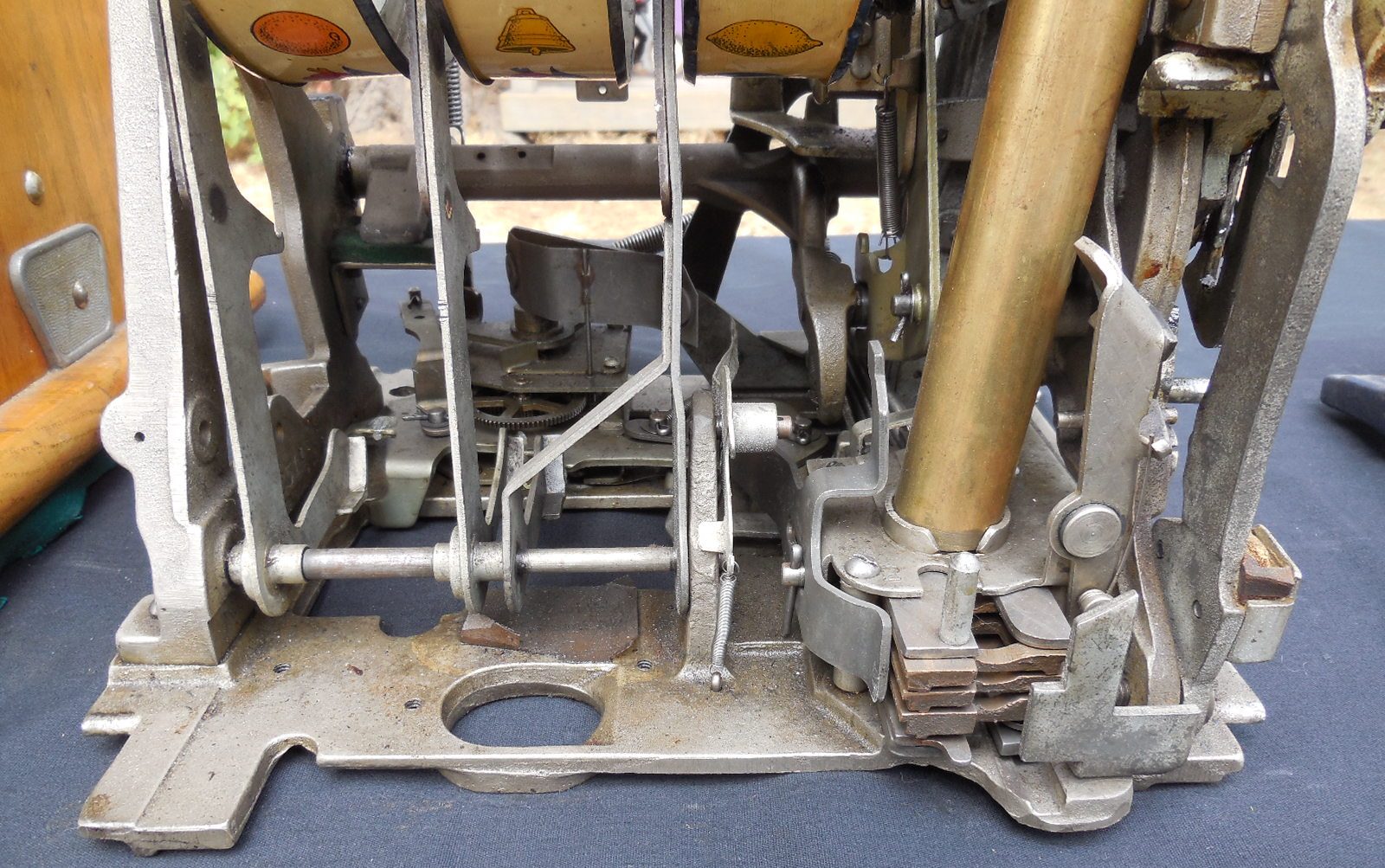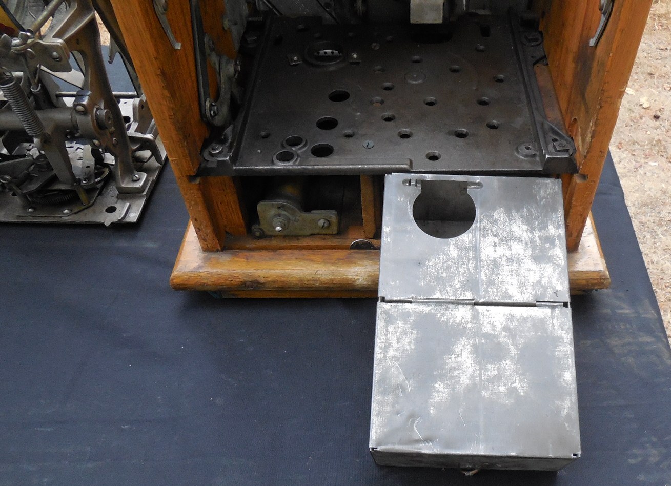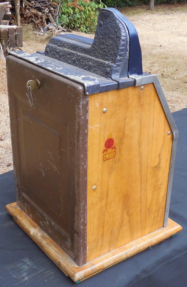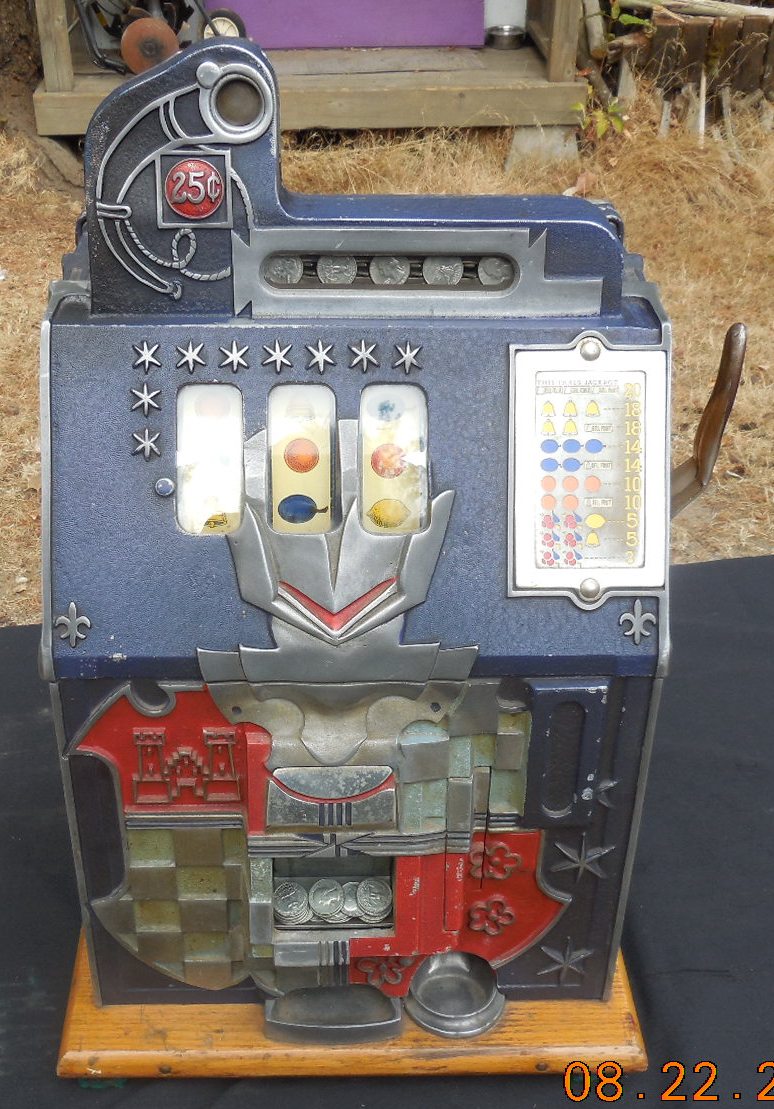 This is a very nice Mills $0.25 cent Castle Front slot machine in original condition including reel strips and paper tags. The reel and jackpot glass has been replaced. The jackpot and coin escalator have been rebuilt. Everything works like new, plays and pays just fine. This is a nice looking machine and is available at a reasonable price. This machine has the original patina so that while sitting on display boasts it uniqueness telling the world “I am an antique” Completely service, lubricated and adjusted for worry free play. If this one isn’t quite what you want then have a look at our restored $0.10 Castle Front